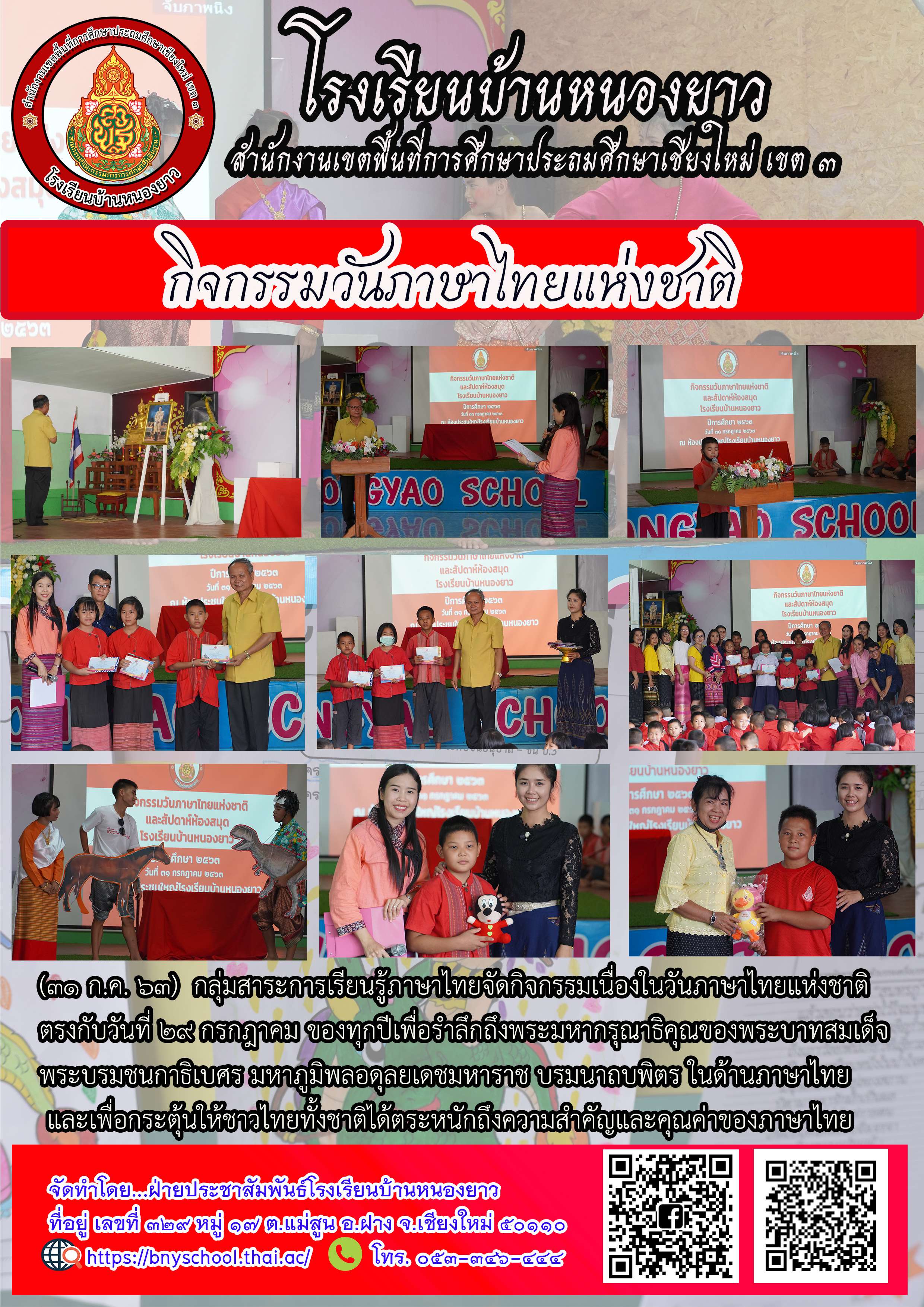 (31 ก.ค. 63) กลุ่มสาระการเรียนรู้ภาษาไทยจัดกิจกรรมเนื่องในวันภาษาไทยแห่งชาติตรงกับวันที่ 29 กรกฎาคม ของทุกปีเพื่อรำลึกถึงพระมหากรุณาธิคุณของพระบาทสมเด็จพระบรมชนกาธิเบศร มหาภูมิพลอดุลยเดชมหาราช บรมนาถบพิตร ในด้านภาษาไทยและเพื่อกระตุ้นให้ชาวไทยทั้งชาติได้ตระหนักถึงความสำคัญและคุณค่าของภาษาไทย