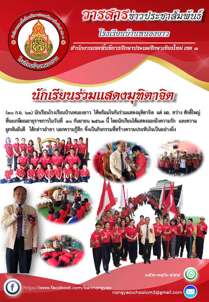 (30 ก.ย. 63) นักเรียนโรงเรียนบ้านหนองยาว ได้พร้อมใจกันร่วมแสดงมุทิตาจิต แด่ ผอ. สว่าง ศักดิ์ใหญ่ ที่จะเกษียณอายุราชการในวันที่ 30 กันยายน 2563 นี้ โดยนักเรียนได้แสดงออกถึงความรัก และความผูกพันอันดี ได้กล่าวอำลา บอกความรู้สึก ซึ่งเป็นกิจกรรมที่สร้างความประทับใจเป็นอย่างยิ่ง