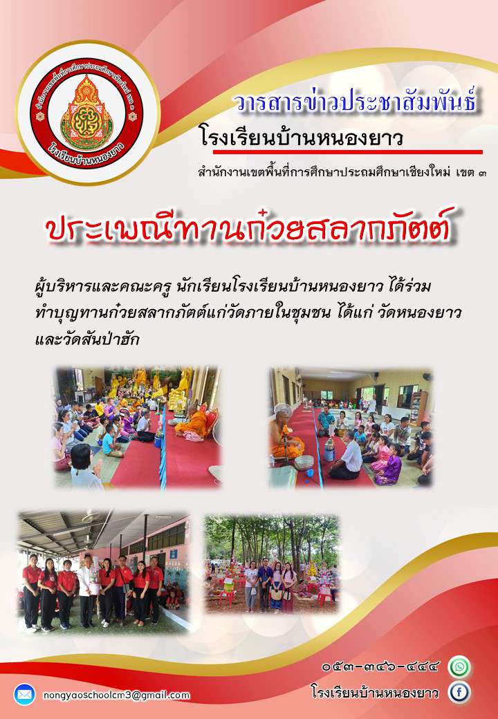 ผู้บริหารและคณะครู นักเรียนโรงเรียนบ้านหนองยาว ได้ร่วมทำบุญทานก๋วยสลากภัตต์แก่วัดภายในชุมชน ได้แก่ วัดหนองยาว และวัดสันป่าฮัก