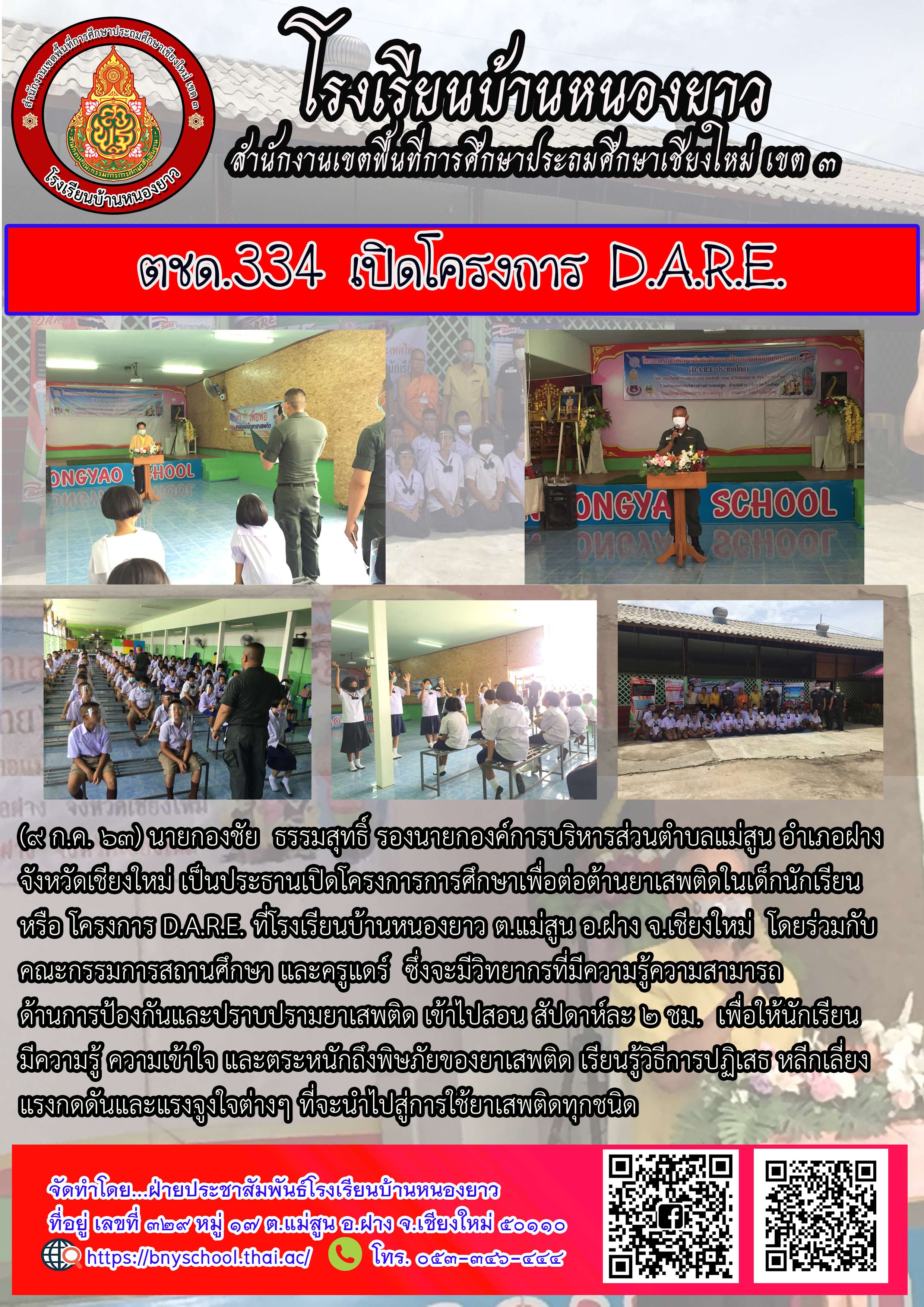 (9 ก.ค. 63) นายกองชัย ธรรมสุทธิ์ รองนายกองค์การบริหารส่วนตำบลแม่สูน อำเภอฝางจังหวัดเชียงใหม่ เป็นประธานเปิดโครงการการศึกษาเพื่อต่อต้านยาเสพติดในเด็กนักเรียน หรือ โครงการ D.A.R.E. ที่โรงเรียนบ้านหนองยาว ต.แม่สูน อ.ฝาง จ.เชียงใหม่ โดยร่วมกับคณะกรรมการสถานศึกษา และครูแดร์ ซึ่งจะมีวิทยากรที่มีความรู้ความสามารถด้านการป้องกันและปราบปรามยาเสพติด เข้าไปสอน สัปดาห์ละ 2 ชม. เพื่อให้นักเรียนมีความรู้ ความเข้าใจ และตระหนักถึงพิษภัยของยาเสพติด เรียนรู้วิธีการปฏิเสธ หลีกเลี่ยงแรงกดดันและแรงจูงใจต่างๆ ที่จะนำไปสู่การใช้ยาเสพติดทุกชนิด