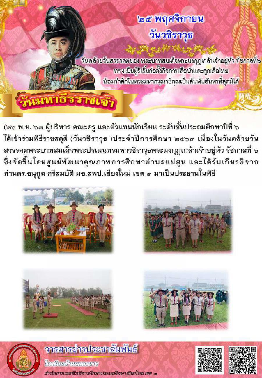 (26 พ.ย. 63 ผู้บริหาร คณะครู และตัวแทนนักเรียน ระดับชั้นประถมศึกษาปีที่ 6ได้เข้าร่วมพิธีราชสดุดี (วันวชิราวุธ )ประจำปีการศึกษา 2563 เนื่องในวันคล้ายวันสวรรคตพระบาทสมเด็จพระปรเมนทรมหาวชิราวุธพระมงกุฎเกล้าเจ้าอยู่หัว รัชกาลที่ 6 ซึ่งจัดขึ้นโดยศูนย์พัฒนาคุณภาพการศึกษาตำบลแม่สูน และได้รับเกียรติจาก ท่านดร.อนุกูล ศรีสมบัติ ผอ.สพป.เชียงใหม่ เขต 3 มาเป็นประธานในพิธี